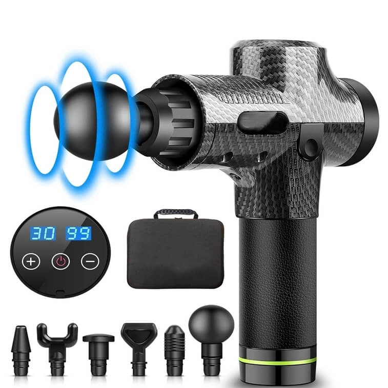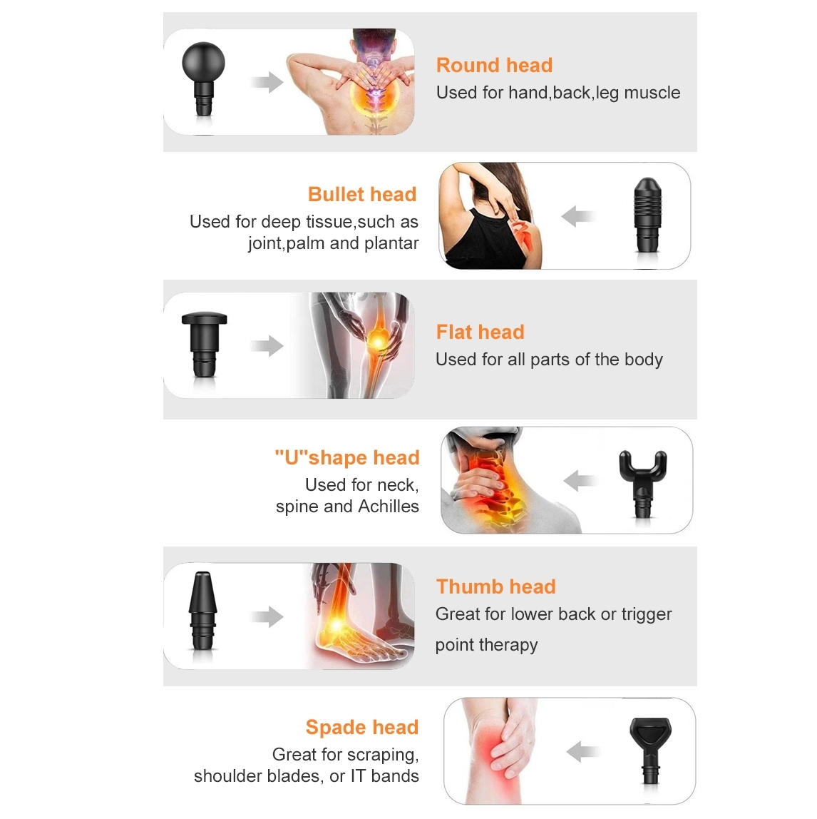 Pistol de masaj de 24v, cu frecventa de vibratie de 1600-3200 rpm, ideal pentru eliberarea tensiunii musculare, stimularea circulatiei sangelui, dar si pentru relaxare. Este un aparat de masaj revolutionar datorita designului compact si simplitatii cu care poate si utilizat. Vine cu 6 capuri interschimbabile, fiecare pentru un tip diferit de masaj. Capacitatea de rezistenta este de pana la 6 ore in functie de tipul de masaj.